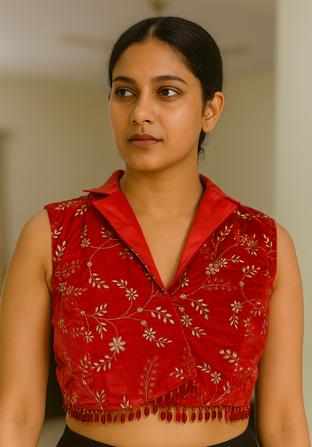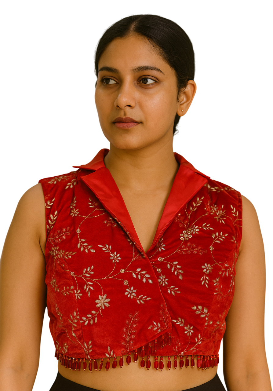 - Luxurious Velvet Fabric: Rich, soft velvet material that adds elegance and comfort. Intricate Embroidery Design: Beautifully crafted embroidery on the blouse front for a premium look. Attached Sleeve Fabric: Matching sleeve fabric included, making it easy to customize sleeve length and fit. Ready for Stitching: Perfect for tailoring into a custom-fitted blouse. Ideal for Festive & Ethnic Wear: Suitable for weddings, parties, and traditional occasions
